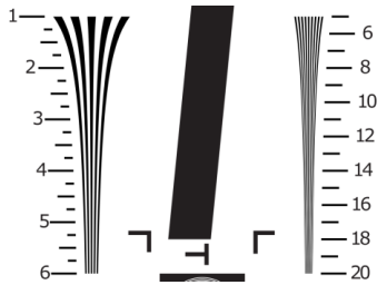 ? ? ? ?雙曲線楔是在白色背景上黑色線條的收斂集合,在空間頻率上線性增加。 如下圖1(ISO 12233:2000分辨率測(cè)試卡的實(shí)物的截取部分)包含有兩種5個(gè)和9個(gè)線條的楔形。 ISO 12233:2000和2014修訂版都規(guī)定了楔形對(duì)比度在40:1和80:1之間,對(duì)于這種高對(duì)比度沒有真正的理由,這經(jīng)常導(dǎo)致飽和和削波問題,并且不代表需要區(qū)分的真實(shí)對(duì)象。通過實(shí)踐表明,我們更認(rèn)可對(duì)比度在10:1左右的。