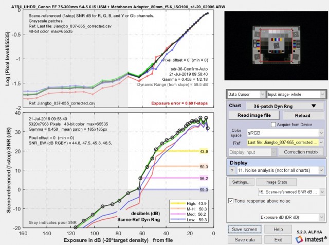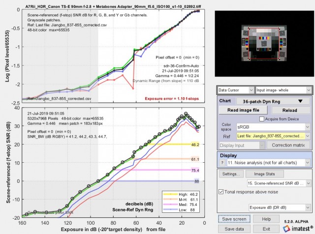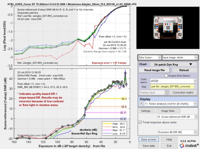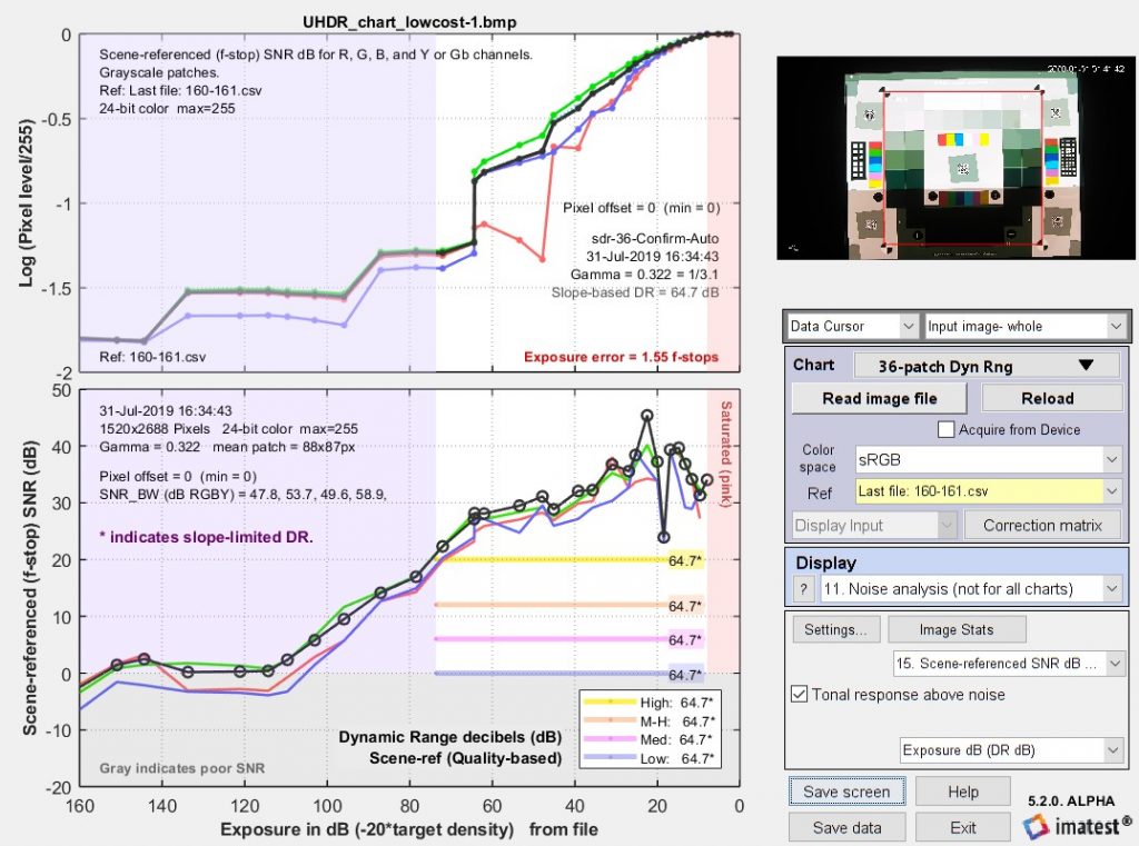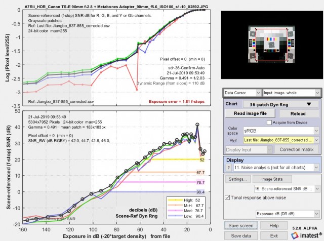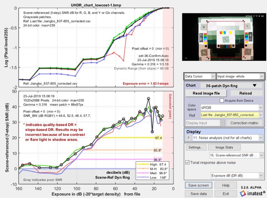 ? ? ? ?請注意,在上面四幅圖像中的三幅中,低質(zhì)量的動(dòng)態(tài)范圍低于“坡度”的動(dòng)態(tài)范圍,而在其余圖像中,它們非常接近。我們不建議單獨(dú)使用基于斜率的dr(因?yàn)樗ǔ_h(yuǎn)遠(yuǎn)超出snr=0db(信號/噪聲=1)的區(qū)域,也就是說,它包括了snr差導(dǎo)致噪聲完全掩蓋圖像細(xì)節(jié)的區(qū)域。