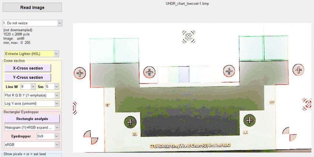 ? ? ? ?幸運(yùn)的是,對于具有圓形配置的動(dòng)態(tài)范圍測試圖(如上面所示的36塊dr圖)來說,這并不困難。(對于線性圖表來說比較困難)。由于面片排列,當(dāng)光斑控制場景時(shí),面片級別停止降低。在上面的例子中,這在下面兩行中是清晰可見的,在這兩行中,圖像從上到下變得更暗-垂直于補(bǔ)丁序列。當(dāng)斑塊亮度停止下降時(shí),我們可以確信耀斑光占主導(dǎo)地位,也就是說,我們在攝像機(jī)動(dòng)態(tài)范圍之外。這種情況適用于超出基于坡度的動(dòng)態(tài)范圍的面片。